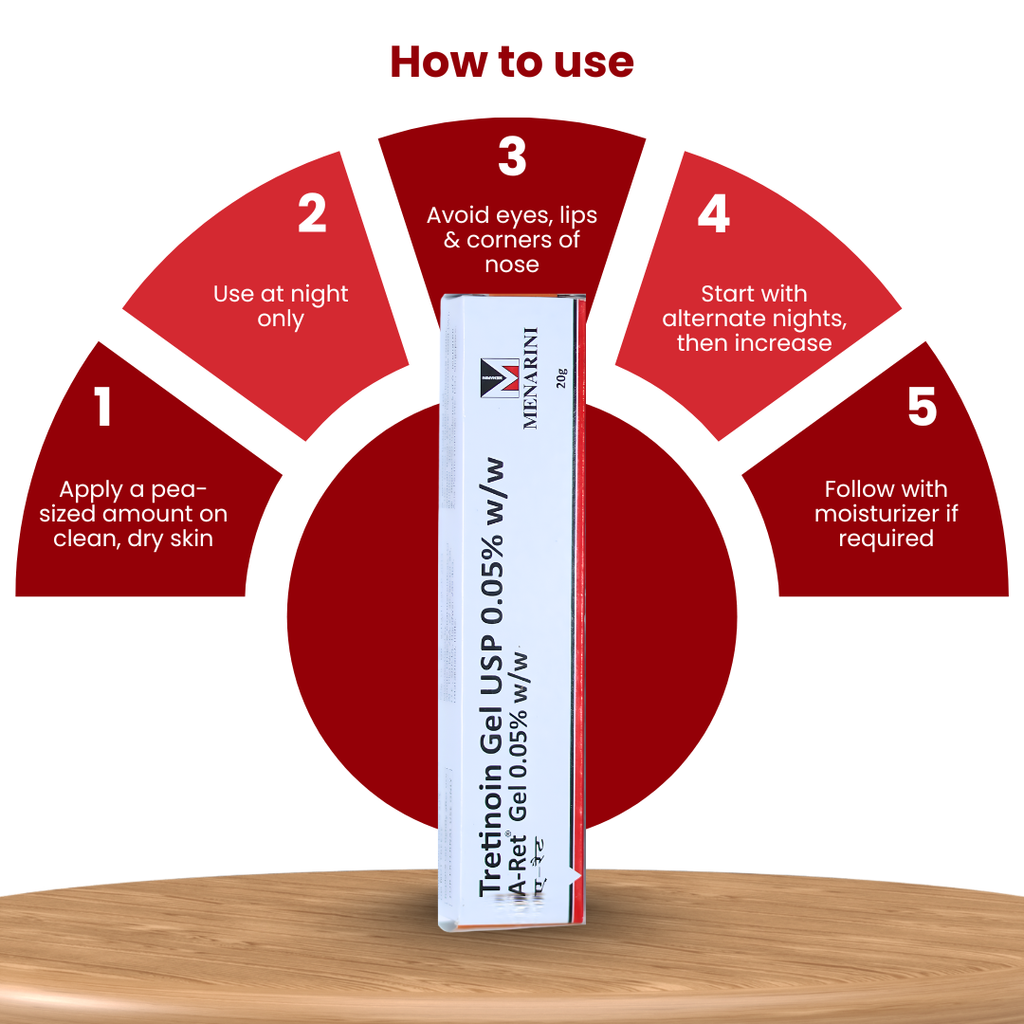 Cleanse and dry the affected area. Apply a thin layer of A-Ret 0.05% Gel once daily, preferably at night, as prescribed by your dermatologist. Start with 2–3 times per week if sensitive skin and gradually increase. Use sunscreen during the day.
