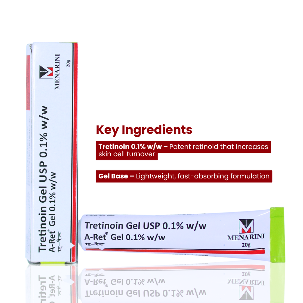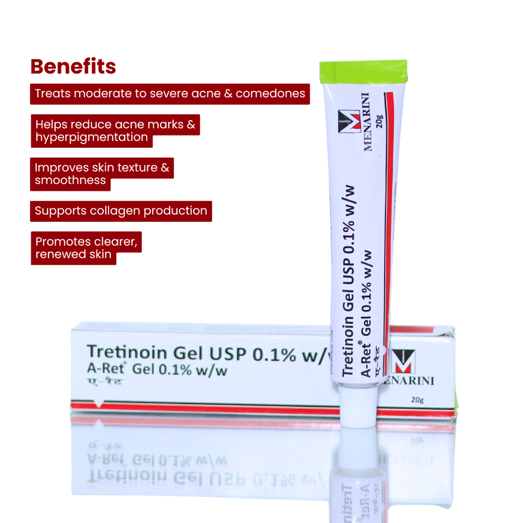 A-Ret 0.1% Gel is a prescription-strength topical treatment containing 0.1% Retinoic Acid (Tretinoin). It is widely used for managing acne, post-acne marks, hyperpigmentation, and early signs of aging. The gel works by promoting skin cell turnover, unclogging pores, and reducing excess oil, helping prevent breakouts and fading dark spots.