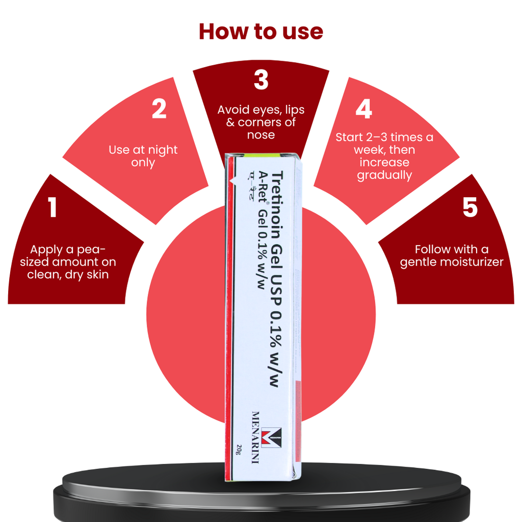 Cleanse and dry the affected area. Apply a thin layer of A-Ret 0.1% Gel once daily at night, as prescribed by your dermatologist. Sensitive skin users should start 2–3 times per week and gradually increase frequency. Always apply sunscreen during the day.