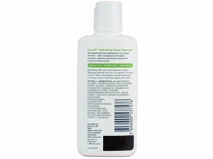 CeraVe Hydrating Facial Cleanser is a gentle, non-foaming cleanser formulated to cleanse and hydrate normal to dry skin without disrupting the skin’s natural protective barrier. This cleanser is designed to remove dirt, oil, and makeup while maintaining moisture, making it ideal for sensitive or dry skin types. It helps restore the skin's natural barrier with a blend of essential ingredients.