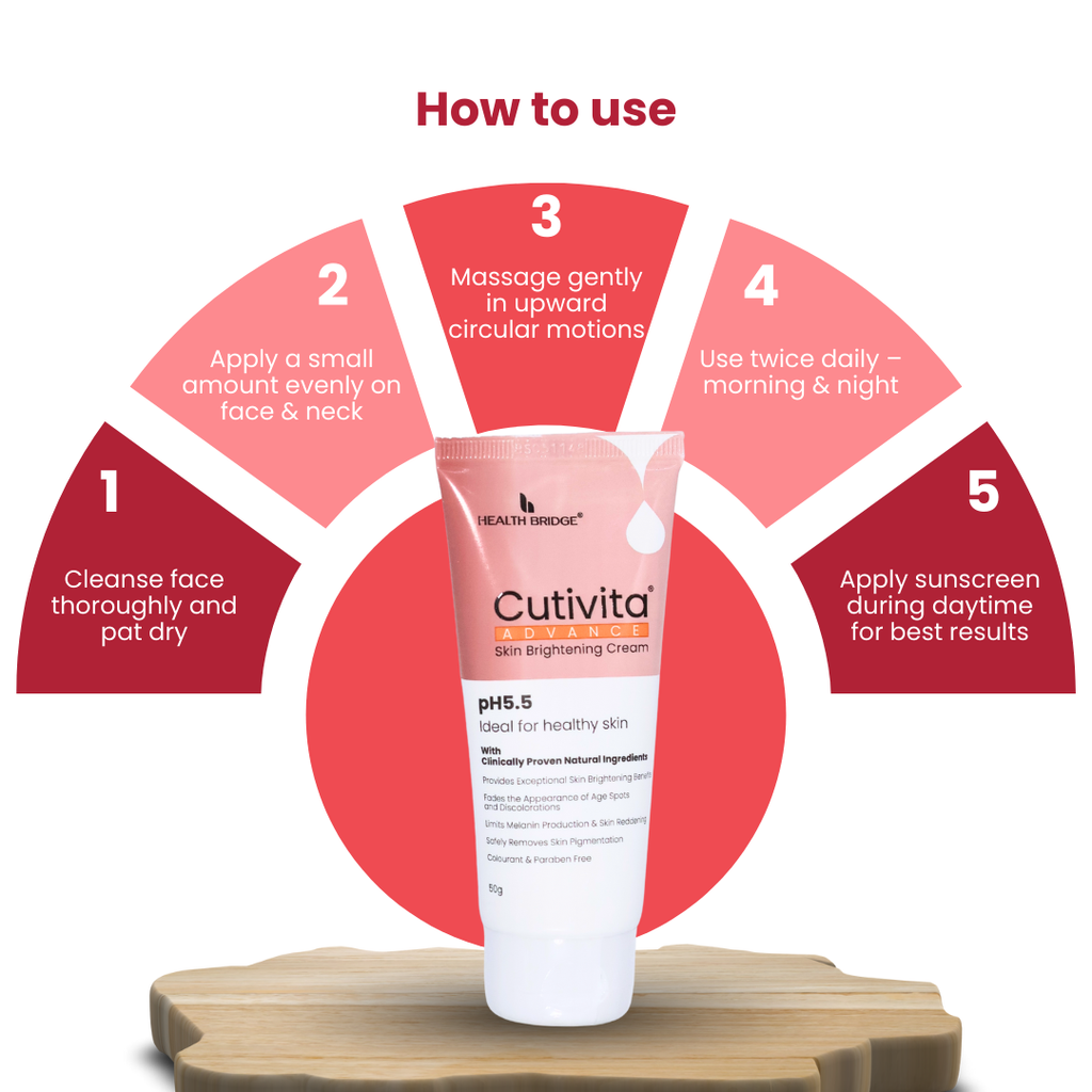 Apply a thin layer of Cutivita Advance Skin Brightening Cream on clean, dry skin. Use as directed by a healthcare professional and apply sunscreen during daytime use.