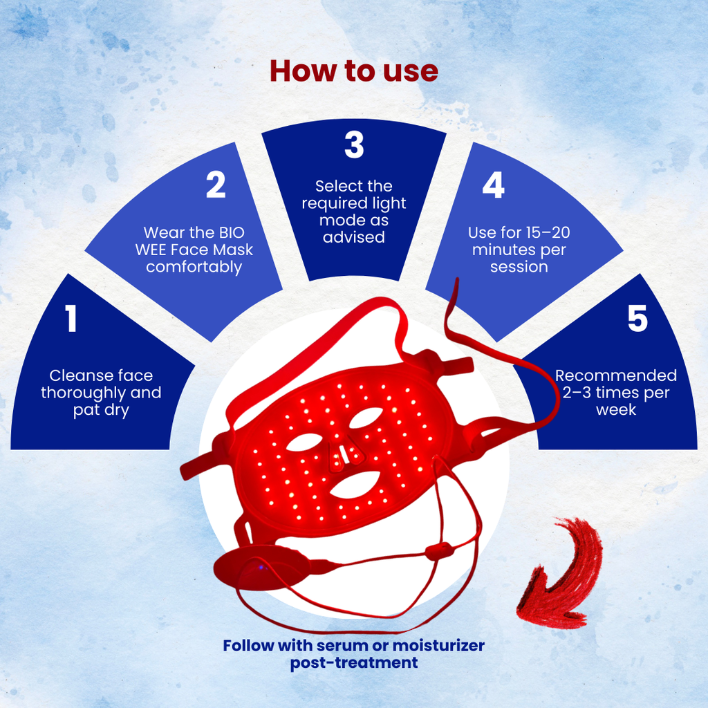 Cleanse your face thoroughly before use. Wear the Dermaindia BIO WEE Gradient Light Source Facemask and select the recommended mode as per guidance. Use for the advised duration and frequency.