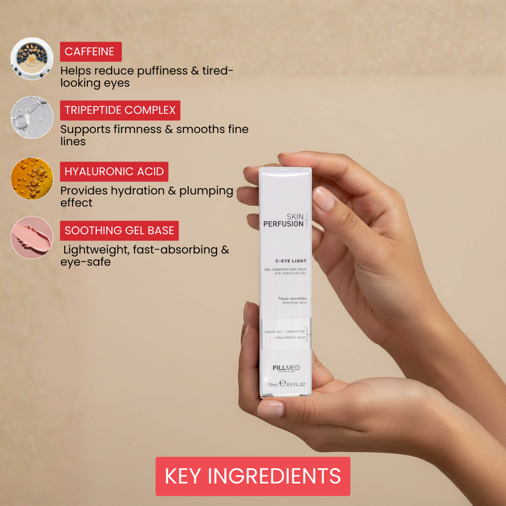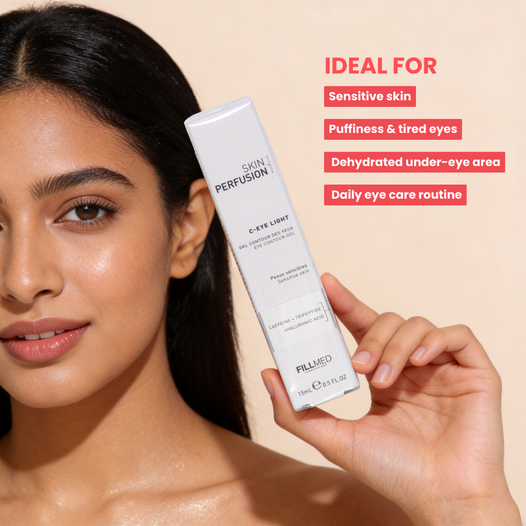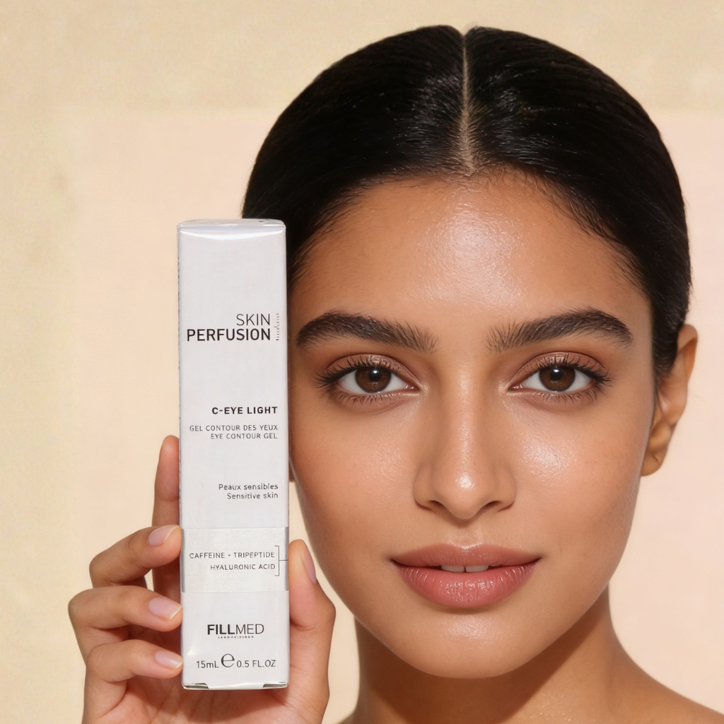 Fillmed Skin Perfusion C-Eye Light Contour Gel is a targeted eye care formulation designed to help reduce dark circles, smooth fine lines, and refresh the eye contour area. Its lightweight gel texture absorbs quickly, delivering hydration without heaviness.
