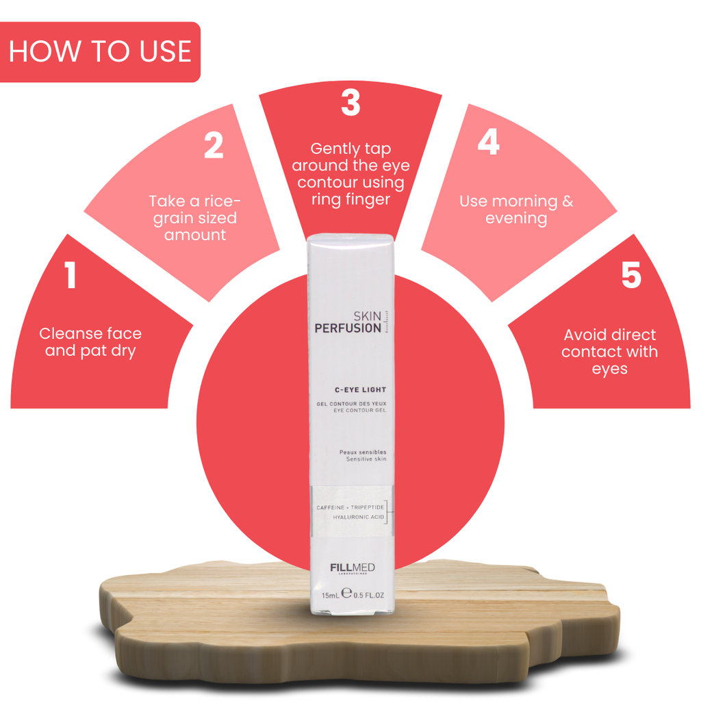 Apply a small amount of Fillmed Skin Perfusion C-Eye Light Contour Gel around the eye contour area. Gently pat until fully absorbed. Use once or twice daily as directed.
