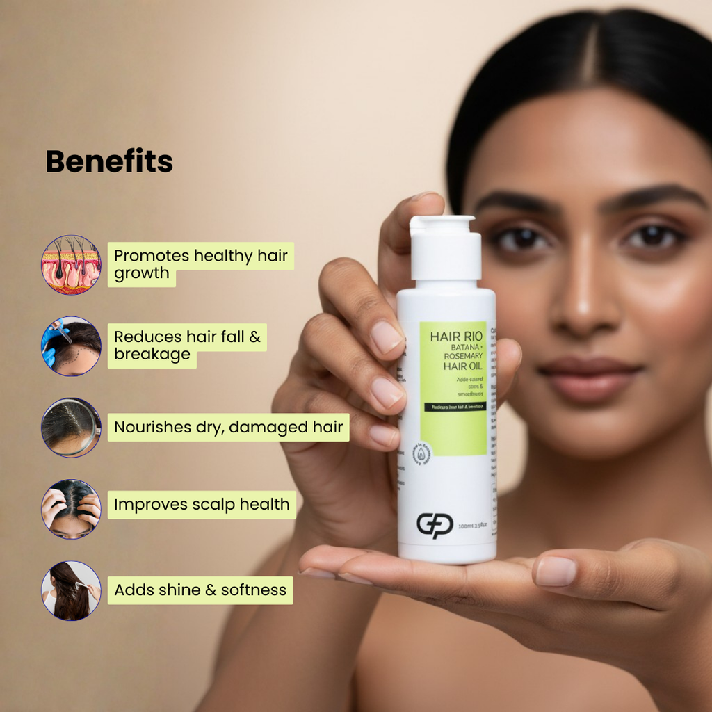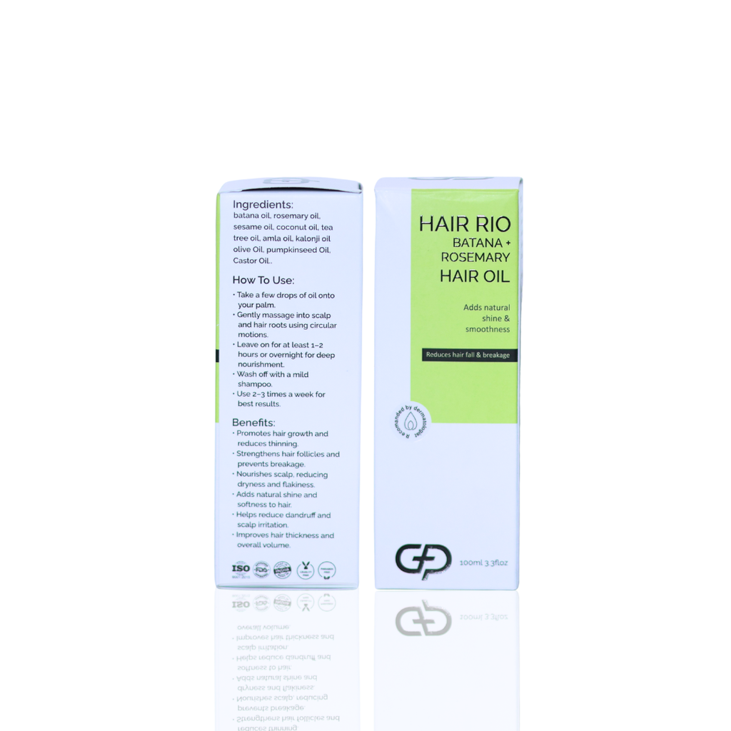 Hair Rio Batana Rosemary Hair Oil is a nutrient-rich hair oil formulated to support healthy hair growth and scalp nourishment. Powered by batana oil and rosemary extract, it helps strengthen hair roots, reduce breakage, and improve overall hair density with regular use.