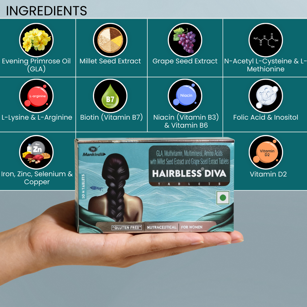 Hairbless Diva Nutraceutical Tablet for Women is a scientifically formulated supplement designed to support healthy hair growth from within. It helps address common female hair concerns such as hair fall, thinning, dullness, and weak strands caused by nutritional deficiencies, hormonal changes, or lifestyle stress.