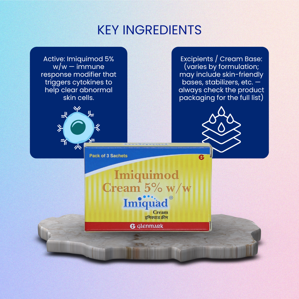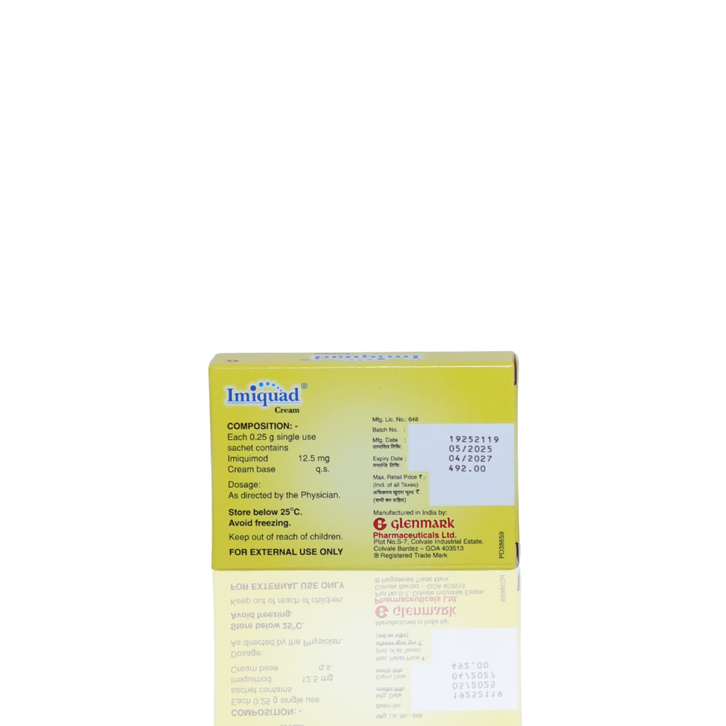 Imiquad Cream Sachet (3 × 0.25 gm) is a prescription-based topical formulation commonly advised by dermatologists for selected skin conditions. It works by stimulating the body’s local immune response to help manage targeted skin concerns effectively.