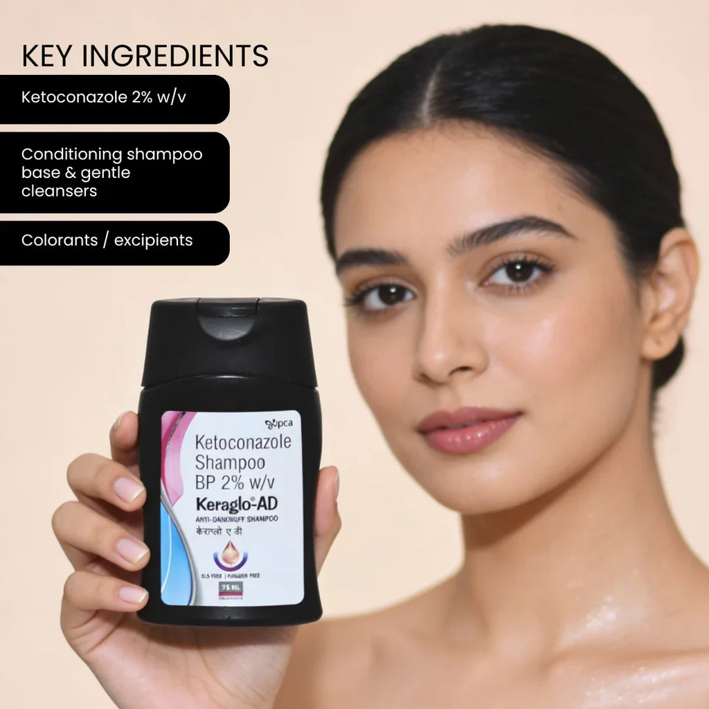 Keraglo-AD Anti-Dandruff Shampoo by IPCA is a dermatologist-recommended formula crafted to treat dandruff, scalp irritation, and flaking from the root cause. Powered by Ketoconazole 2%, a clinically proven antifungal agent, it helps eliminate the fungus responsible for dandruff while soothing the scalp and restoring healthy hair texture.
