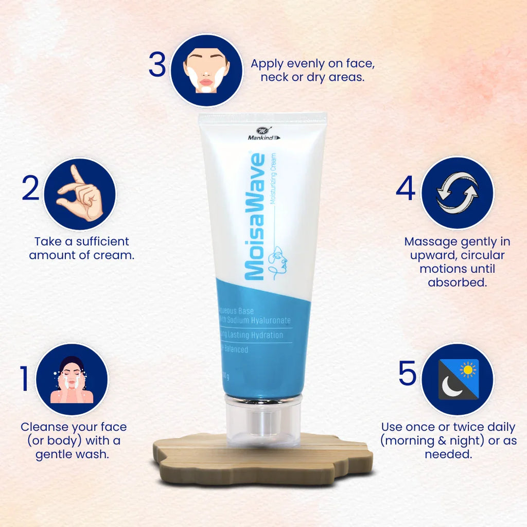 Apply an adequate amount of Moisawave Moisturizing Cream on clean, dry skin. Gently massage until fully absorbed. Use twice daily or as recommended by a dermatologist.