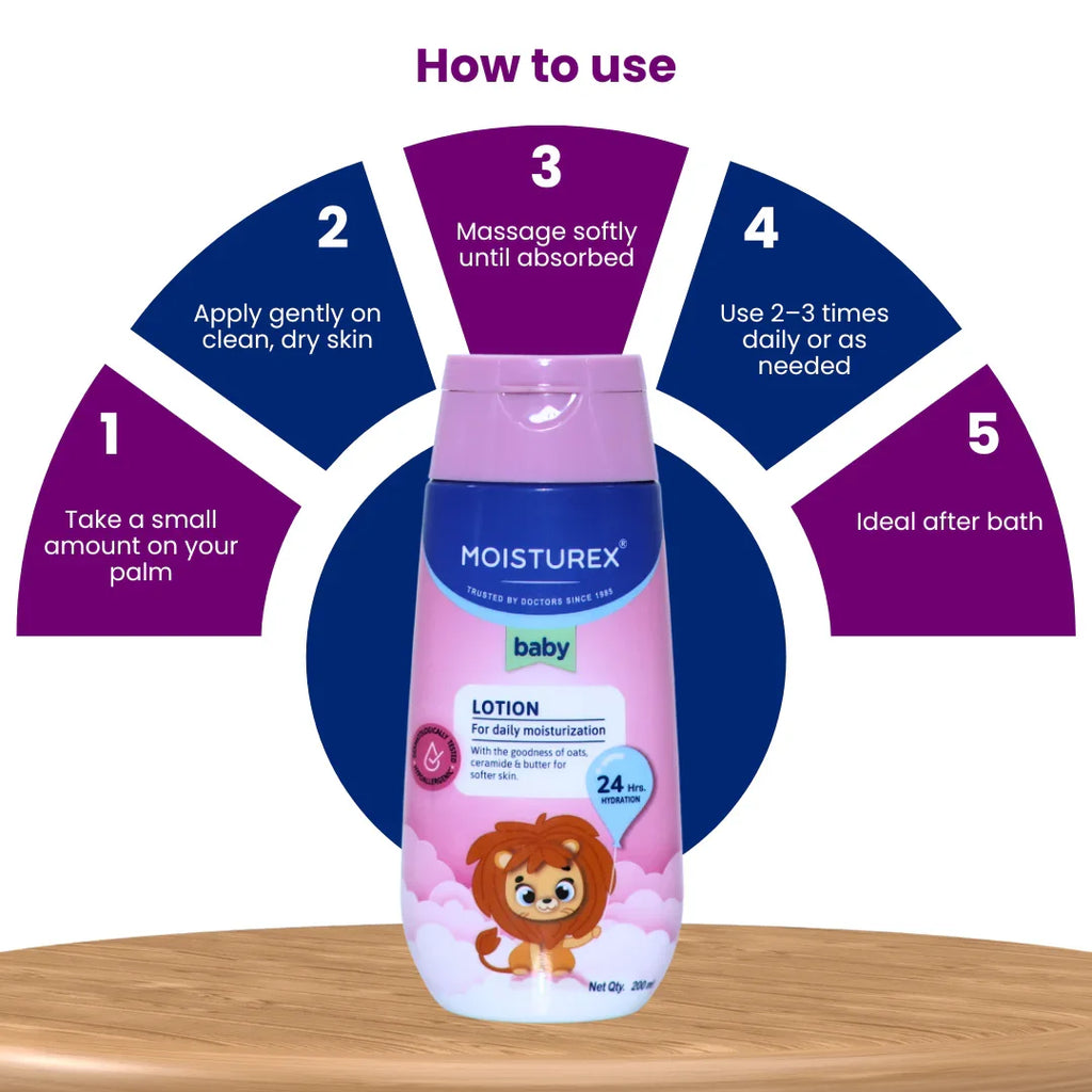 Apply Moisturex Baby Daily Moisturizing Lotion generously over clean, dry skin. Massage gently until absorbed. Use daily or as needed, especially after bathing.