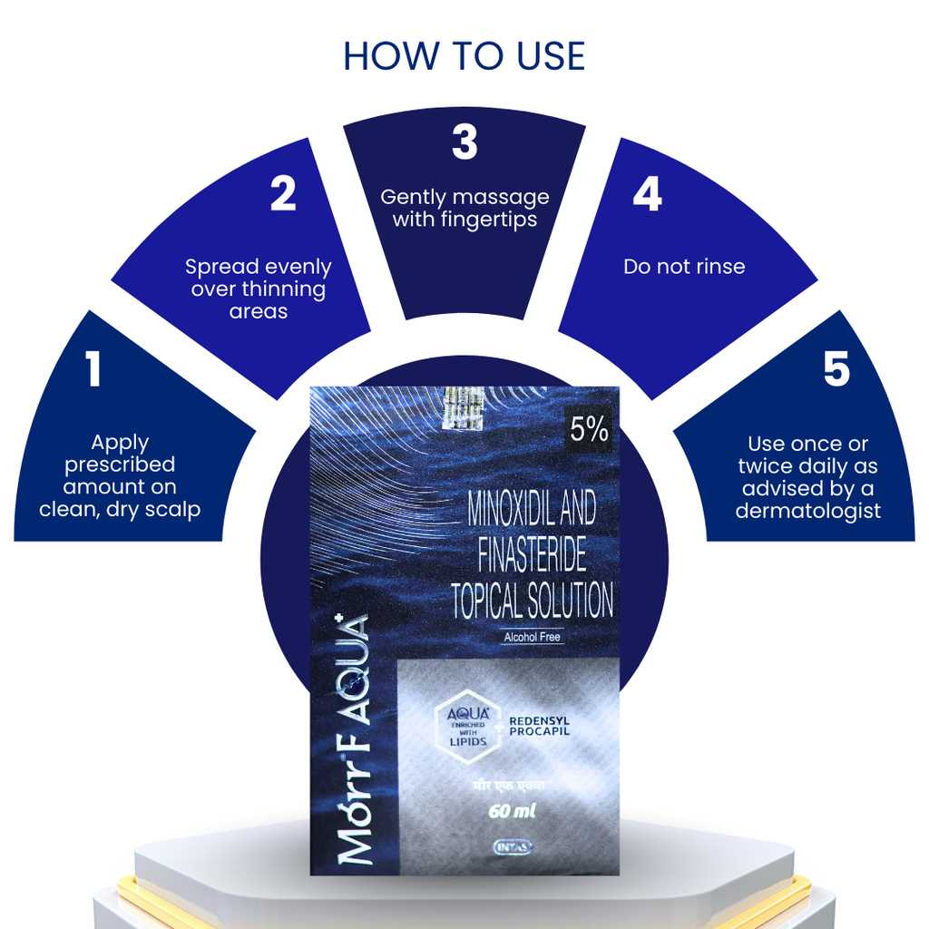 Apply Morr F Aqua Plus 5% Topical Solution to a clean, dry scalp as directed by your doctor, usually twice daily. Gently spread over the affected area and allow it to dry.