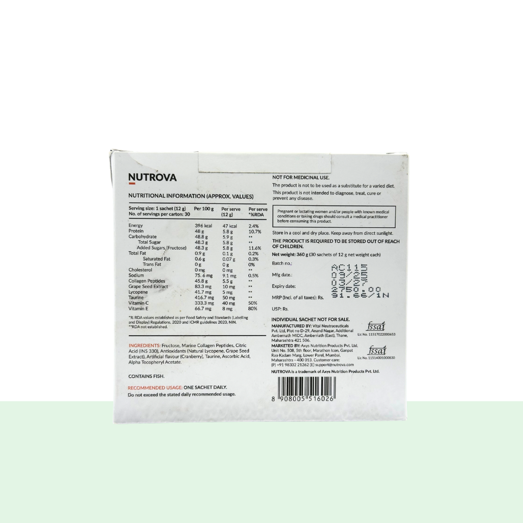 Directions for Use: Mix one serving of Nutrova Collagen + Antioxidants powder in a glass of water or your favorite beverage. Consume daily for visible skin benefits within a few weeks.