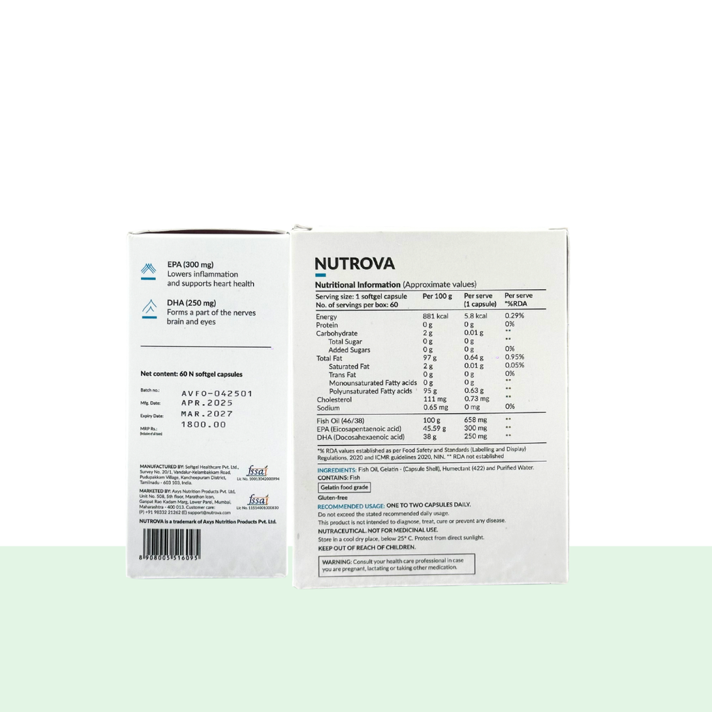 Nutrova Fish Oil 84 undergoes advanced molecular distillation to eliminate toxins like mercury and heavy metals, making it safe for long-term use. Ideal for professionals, athletes, and anyone seeking a clean, effective source of Omega-3 for everyday wellness.