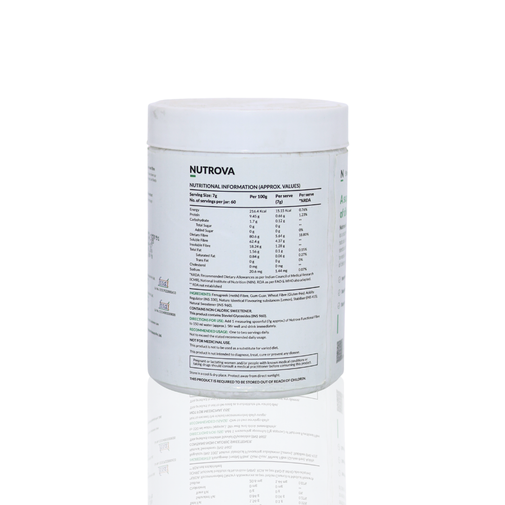 Nutrova Functional Fibre is a scientifically formulated blend of natural prebiotic fibres designed to promote digestive health, gut balance, and regularity. It helps nourish the good bacteria in your gut, improving overall gut flora and enhancing nutrient absorption.