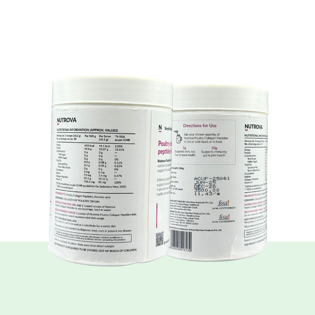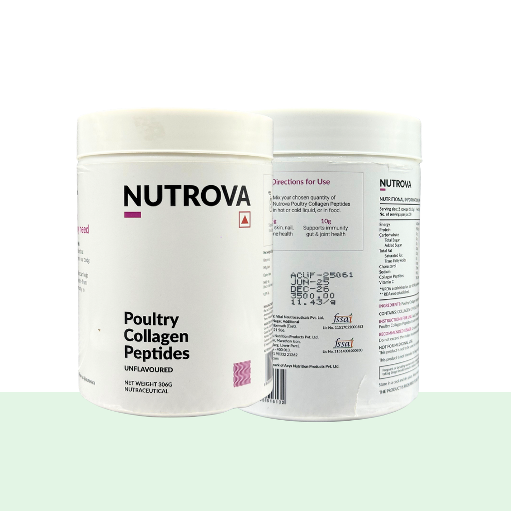 # Nutrova Poultry Collagen Peptides Nutrova Poultry Collagen Peptides is a premium collagen supplement derived from high-quality poultry sources. These bioavailable peptides are designed to support skin, joint, and connective tissue health from within. **Key Benefits:** • Enhances skin elasticity and promotes a youthful complexion • Supports joint flexibility and reduces discomfort during movement • Strengthens hair, nails, and overall structural integrity • Improves gut lining health and digestive wellness • Boosts natural collagen production in the body • Easily absorbed peptides for maximum bioavailability • Supports bone density and skeletal strength **Why Choose Nutrova Poultry Collagen Peptides:** • Sourced from premium poultry for purity and quality • Hydrolyzed for superior absorption and effectiveness • Mixes seamlessly into beverages, smoothies, and meals • Odorless and tasteless for convenient daily use • Clinically researched formulation for proven results • Suitable for vegetarian and health-conscious consumers • No artificial additives or fillers Incorporate Nutrova Poultry Collagen Peptides into your daily routine to experience visible improvements in skin radiance, joint mobility, and overall vitality. Consistent use delivers transformative results for your beauty and wellness goals.
