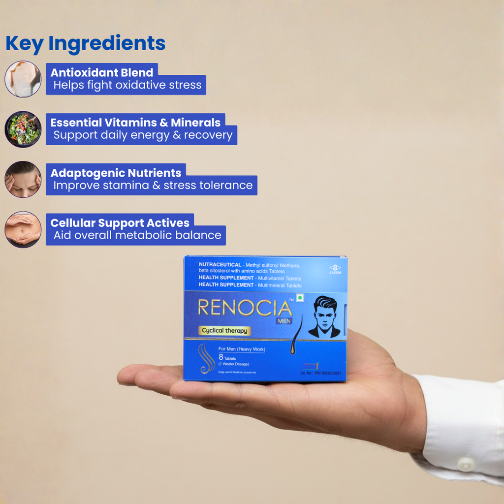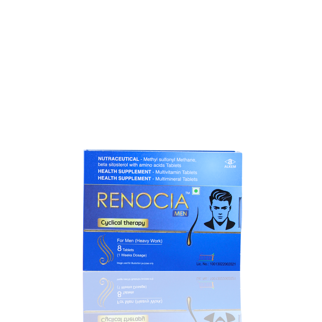 Renocia Men’s Hair Cyclical Therapy Nutraceutical Tablet is a specialized nutritional supplement formulated to support healthy hair growth and reduce hair fall in men. It follows a cyclical therapy approach that nourishes hair follicles at different stages of the hair growth cycle for optimal results.