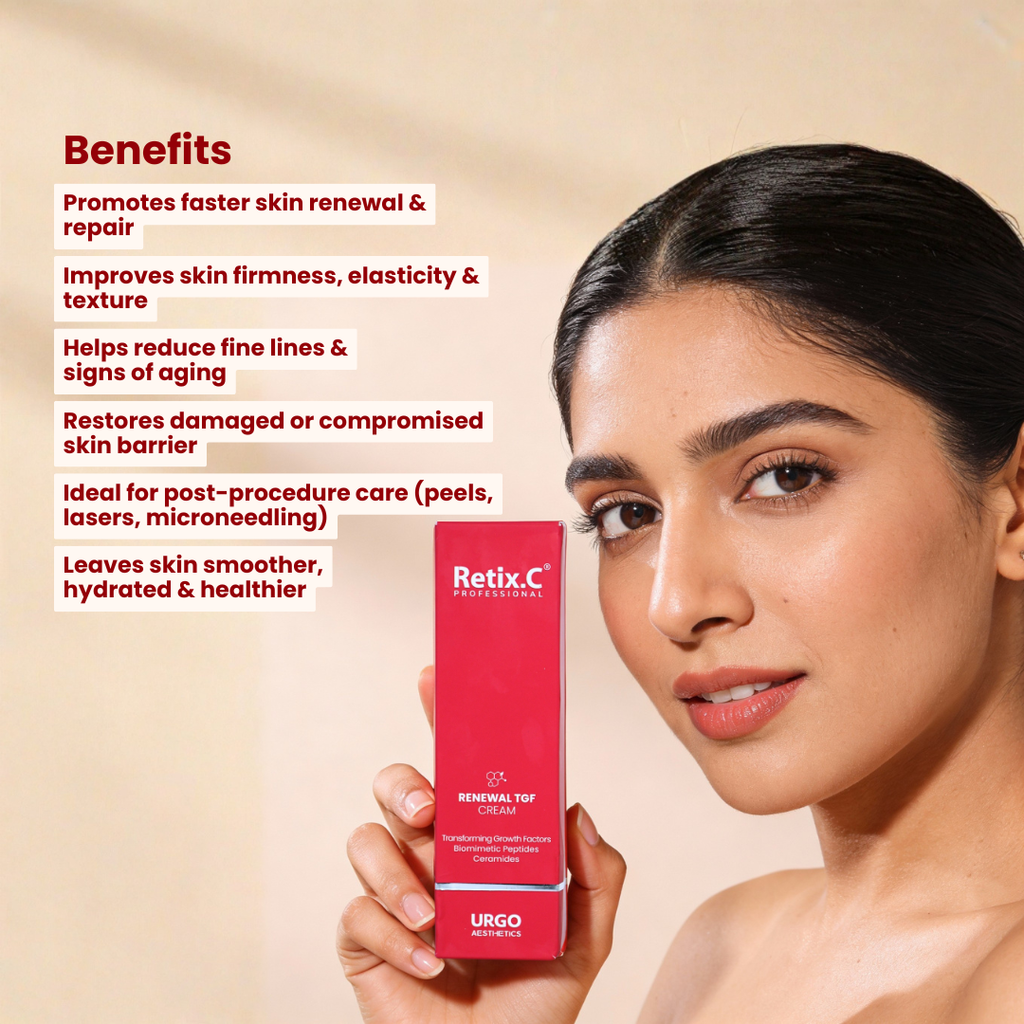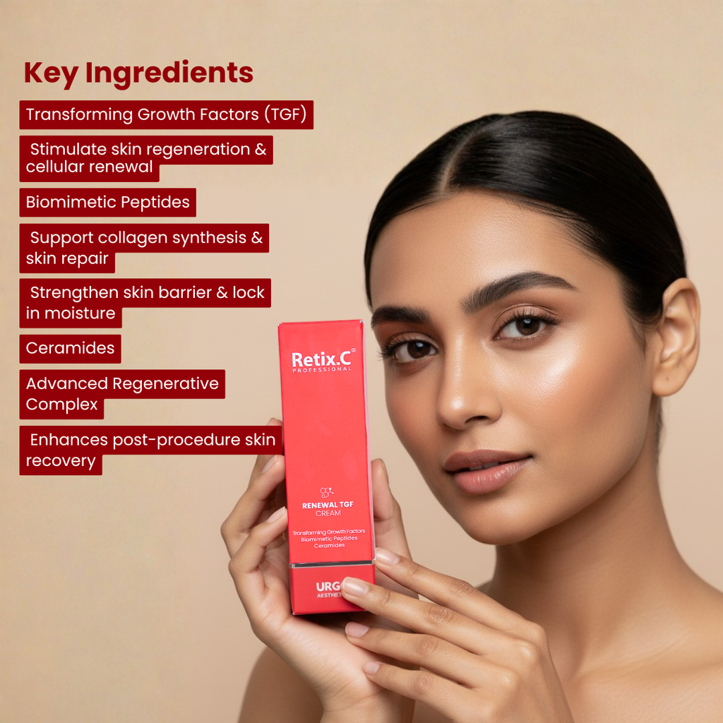 RETIX.C Renewal TGF Cream is an advanced anti-aging and skin renewal formula that combines powerful growth factors, peptides, and hydrating agents. It works to stimulate collagen production, reduce fine lines, and improve skin elasticity, giving your skin a smoother, firmer, and more youthful look.