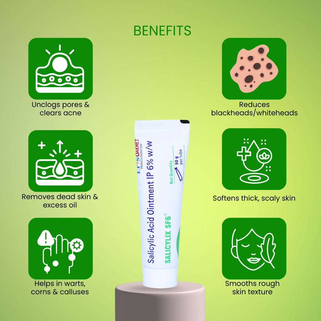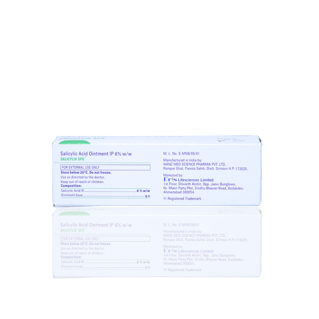 Salicylix SF 6 Ointment is a dermatologically trusted keratolytic formula containing 6% Salicylic Acid, designed to gently exfoliate thickened, rough, or scaly skin. It helps soften and remove dead skin cells, making it highly effective for conditions such as psoriasis, corns, calluses, warts, and chronic dandruff-related scaling.
