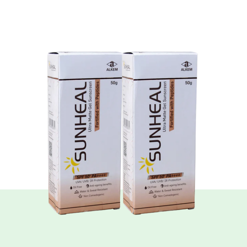 Sunheal Ultra Matte Gel Sunscreen offers broad-spectrum protection against UVA & UVB rays with SPF 50+ and PA++++ rating. Its ultra-lightweight, oil-free gel formula absorbs quickly, leaving a smooth matte finish without any white cast.