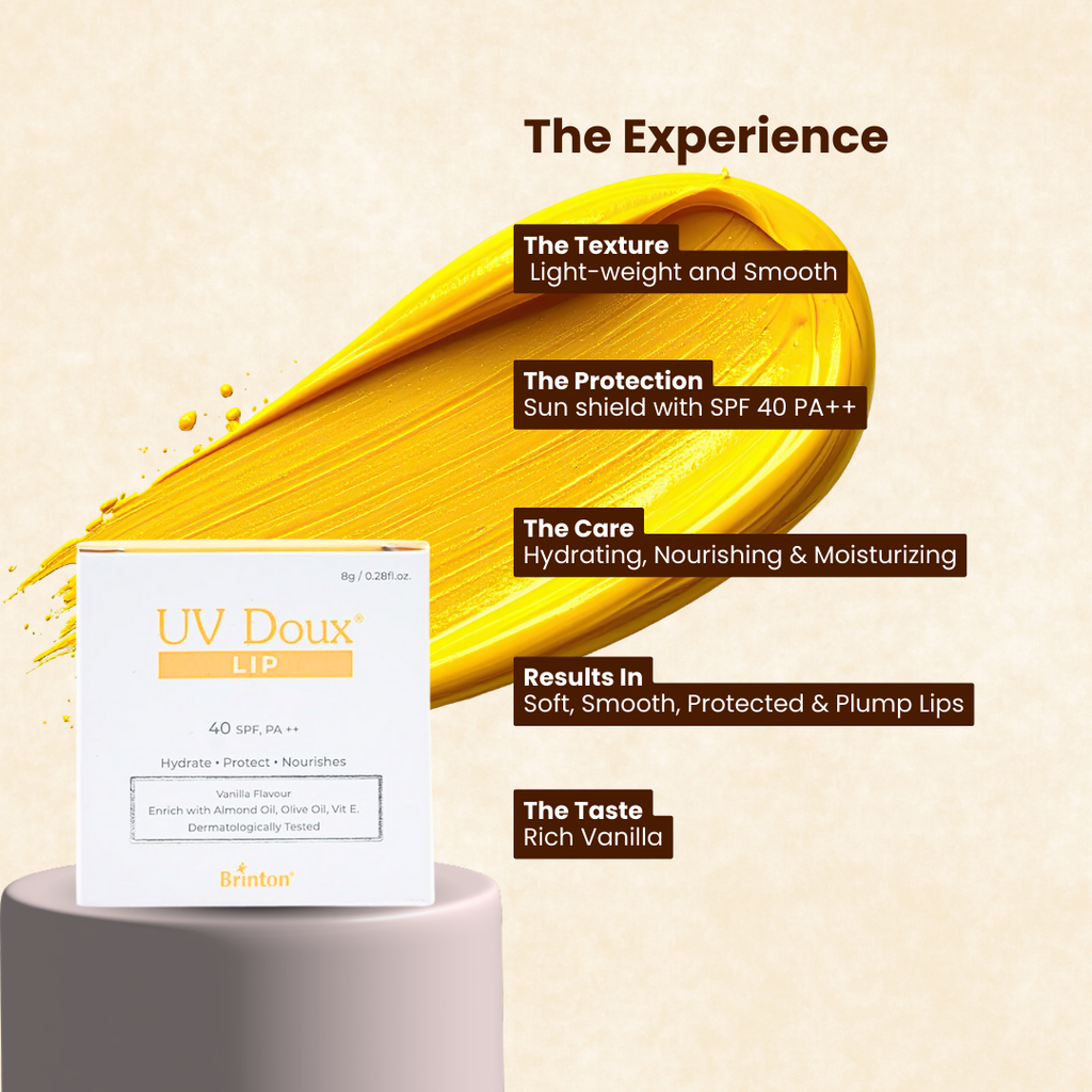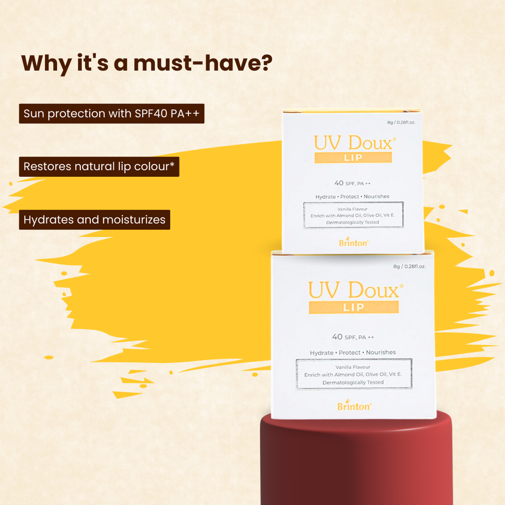 UV Doux Lip Lightening Balm SPF 40 PA++ is a protective and nourishing lip care solution designed to lighten dark lips, prevent sun damage, and maintain hydration. Enriched with natural moisturizers and skin-brightening agents, it helps reduce pigmentation, repair dryness, and restore soft, healthy lips.